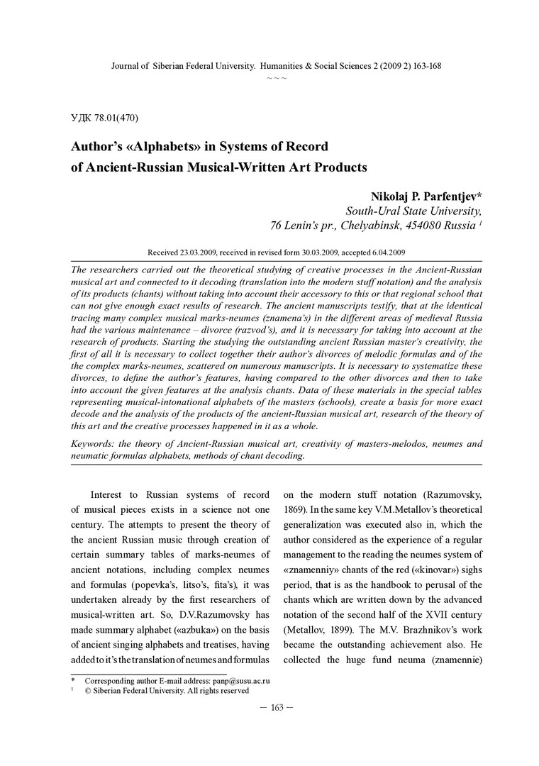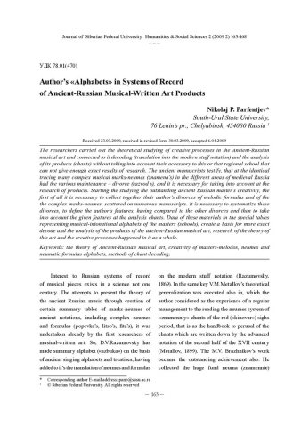 Библиографическое описание:Parfentjev, Nikolaj. Author`s "Alphabets" in Systems of Record of Ancient-Russian Musical-Written Art Products = Авторские "азбуки" в системах записи произведений древнерусского музыкально-письменного искусства / N. P. Parfentjev. - Текст : непосредственный // Журнал Сибирского федерального университета. Гуманитарные науки. - 2009. - Т. 2, № 2. - С. 163-168. - Библиогр.: с. 167-168. - ISSN 1997-1370.