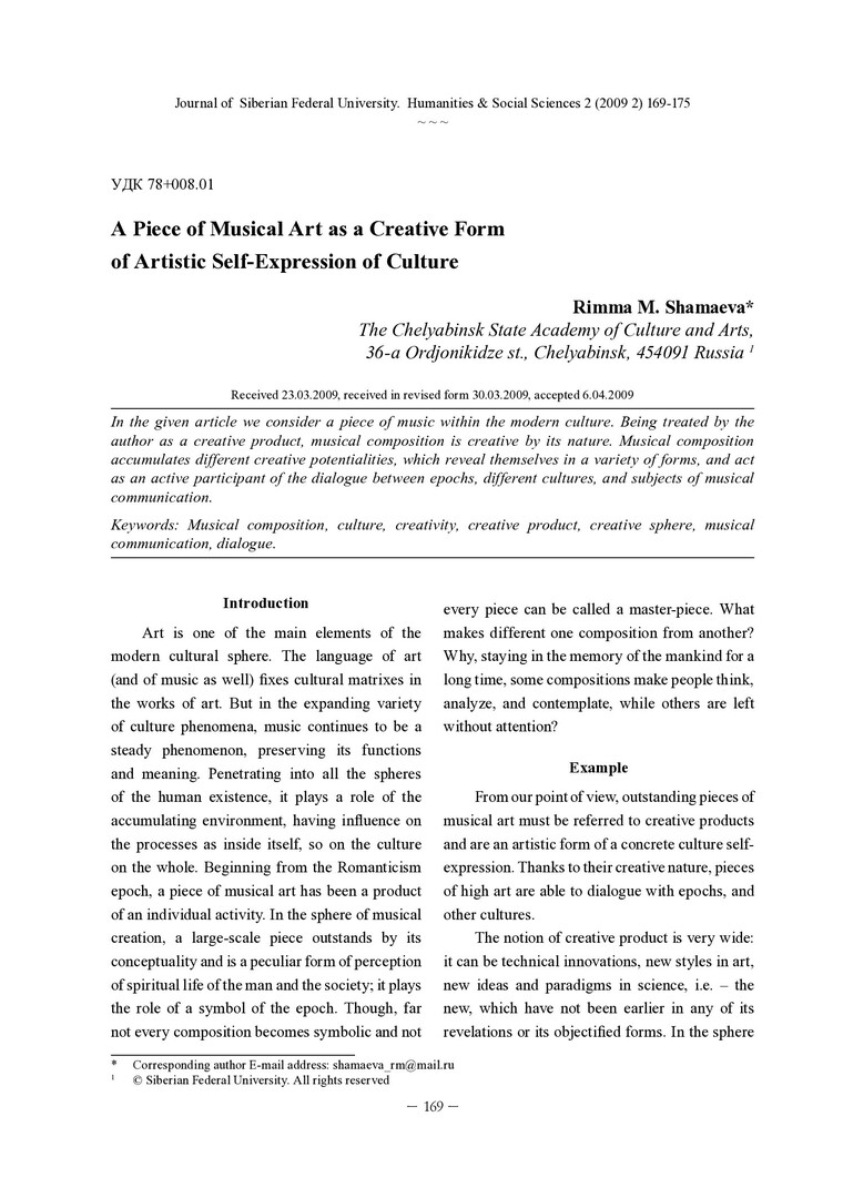 Библиографическое описание:Shamaeva, Rimma. A Piece of Musical Art as a Creative Form of Artistic Self-Expression of Culture = Произведение музыкального искусства – креативная форма художественного самовыражения культуры / R. M. Shamaeva. - Текст : непосредственный // Журнал Сибирского федерального университета. Гуманитарные науки. - 2009. - Т. 2, № 2. - С. 169-175. - Библиогр.: с. 174-175. - ISSN 1997-1370.
