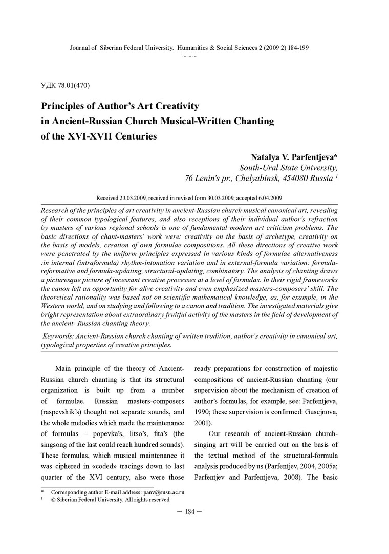 Библиографическое описание:Parfentjeva, Natalya. Principles of Author`s Art Creativity in Ancient-Russian Church Musical-Written Chanting of the XVI-XVII Centuries = Принципы авторского художественного творчества в древнерусском музыкально-письменном искусстве XVI–XVII веков / N. V. Parfentjeva. - Текст : непосредственный // Журнал Сибирского федерального университета. Гуманитарные науки. - 2009. - Т. 2, № 2. - С. 184-199. - Библиогр.: с. 197-199. - ISSN 1997-1370.
