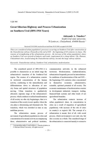 Библиографическое описание:Timofeev, Aleksandr. Great Siberian Highway and Process Urbanization on Southern Ural (1891-1914 Years) = Великая Сибирская магистраль и процесс урбанизации на Южном Урале (1891-1914 годы) / A. A. Timofeev. - Текст : непосредственный // Журнал Сибирского федерального университета. Гуманитарные науки. - 2009. - Т. 2, № 2. - С. 176-183. - Библиогр.: с. 183. - ISSN 1997-1370.