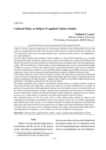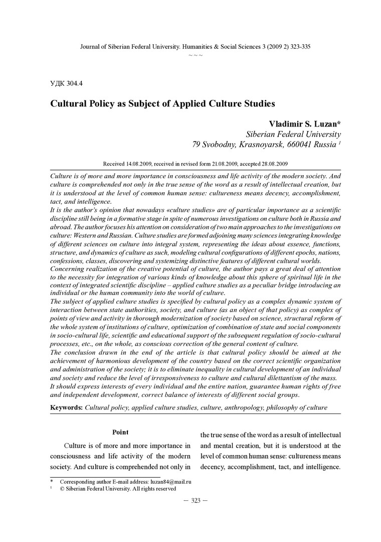 Библиографическое описание:Luzan, Vladimir. Cultural Policy as Subject of Applied Culture Studies = Культурная политика как предмет прикладной культурологии / V. S. Luzan. - Текст : непосредственный // Журнал Сибирского федерального университета. Гуманитарные науки. - 2009. - Т. 2, № 3. - С. 323-335. - Библиогр.: с. 333-335. - ISSN 1997-1370.