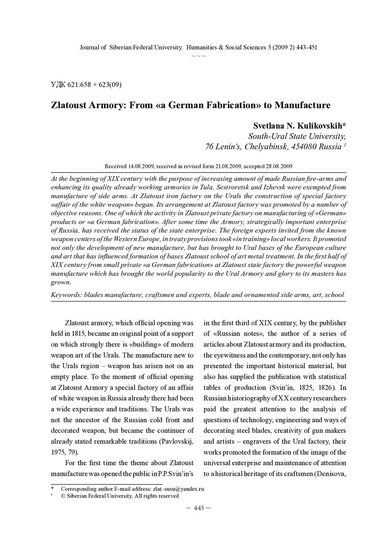 Библиографическое описание:Kulikovskih, Svetlana. Zlatoust Armory: From "a German Fabrication" to Manufacture = Оружейная фабрика Златоуста: от "немецкой фабрикации" к производству / S. N. Kulikovskih. - Текст : непосредственный // Журнал Сибирского федерального университета. Гуманитарные науки. - 2009. - Т. 2, № 3. - С. 443-451. - Библиогр.: с. 450-451. - ISSN 1997-1370.