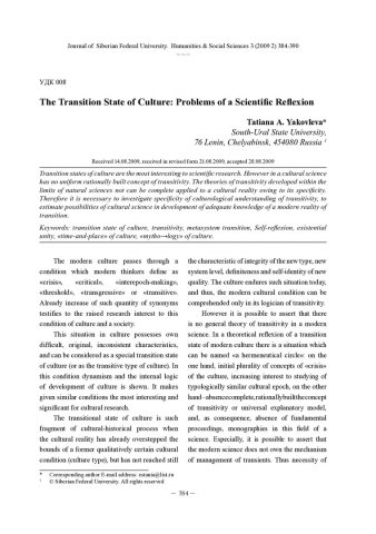 Библиографическое описание:Yakovleva, Tatiana. The Transition State of Culture: Problems of a Scientific Reflexion = Переходный период в Культуре: проблемы научной рефлексии / T. A. Yakovleva. - Текст : непосредственный // Журнал Сибирского федерального университета. Гуманитарные науки. - 2009. - Т. 2, № 3. - С. 384-390. - Библиогр.: с. 389-390. - ISSN 1997-1370.