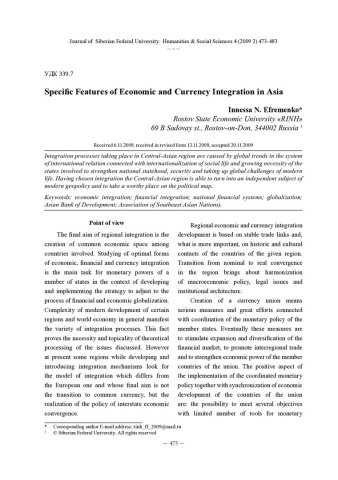 Библиографическое описание:Efremenko, Innessa. Specific Features of Economic and Currency Integration in Asia = Особенности экономической и денежной интеграции в Азии / I. N. Efremenko. - Текст : непосредственный // Журнал Сибирского федерального университета. Гуманитарные науки. - 2009. - Т. 2, № 4. - С. 473-483. - Библиогр.: с. 483. - ISSN 1997-1370.