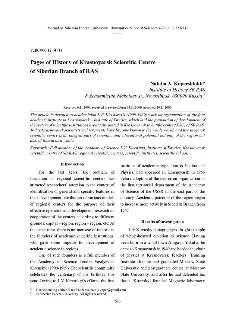 Аннотация:Статья посвящена деятельности академика Л.В. Киренского (1909-1969) по организации первого академического института в Красноярске – Института физики, положившего начало развитию сети научных учреждений, со временем объединенных в Красноярский научный центр СО РАН.