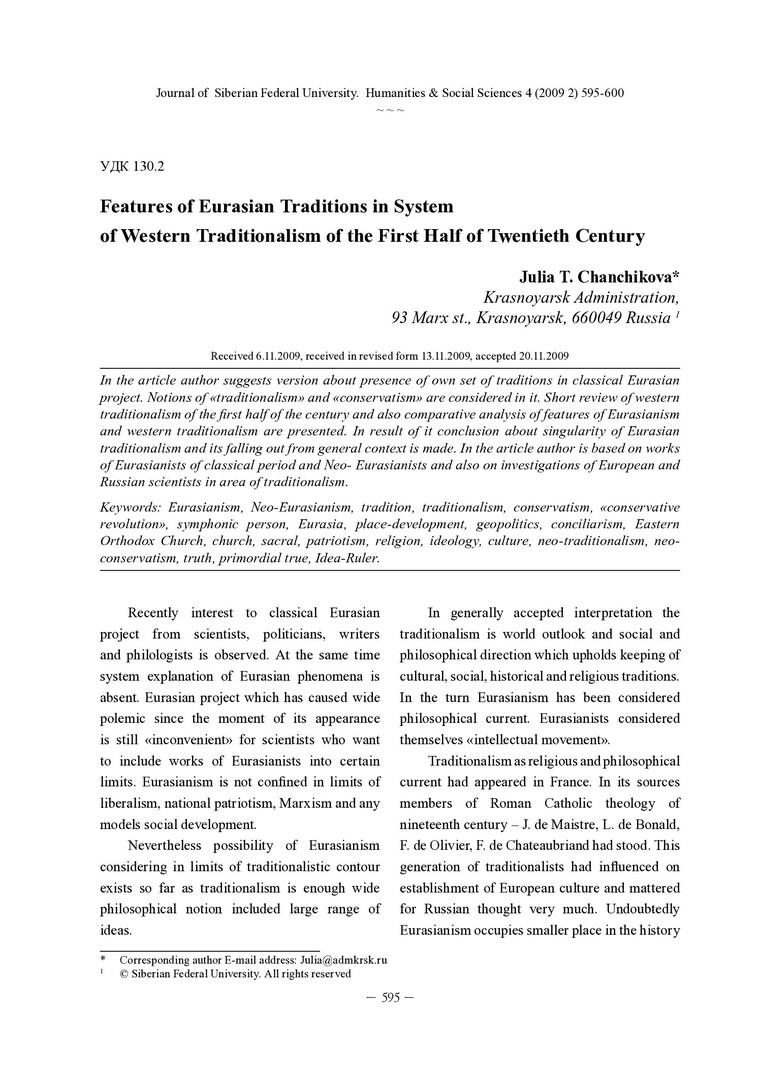 Библиографическое описание:Chanchikova, Julia. Features of Eurasian Traditions in System of Western Traditionalism of the First Half of Twentieth Century = Черты евроазиатских традиций в системе западного традиционализма в первой половине ХХ века / J. T. Chanchikova. - Текст : непосредственный // Журнал Сибирского федерального университета. Гуманитарные науки. - 2009. - Т. 2, № 4. - С. 595-600. - Библиогр.: с. 600. - ISSN 1997-1370.
