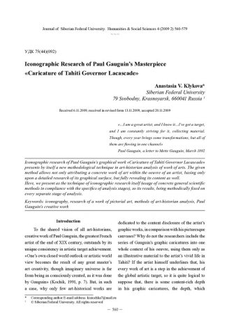Библиографическое описание:Klykova, Anastasia. Iconographic Research of Paul Gauguins Masterpiece "Caricature of Tahiti Governor Lacascade" = Иконографическое исследование произведения Поля Гогена "Карикатура на губернатора Таити Лакаскада" / A. V. Klykova. - Текст : непосредственный // Журнал Сибирского федерального университета. Гуманитарные науки. - 2009. - Т. 2, № 4. - С. 560-579. - Библиогр.: с. 579. - ISSN 1997-1370.