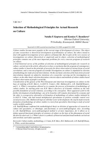 Библиографическое описание:Koptzeva, Natalia. Selection of Methodological Principles for Actual Research on Culture = Выбор методологических оснований для современных культурных исследований / N. P. Koptzeva, K. V. Reznikova. - Текст : непосредственный // Журнал Сибирского федерального университета. Гуманитарные науки. - 2009. - Т. 2, № 4. - С. 491-506. - Библиогр.: с. 504-506. - ISSN 1997-1370.