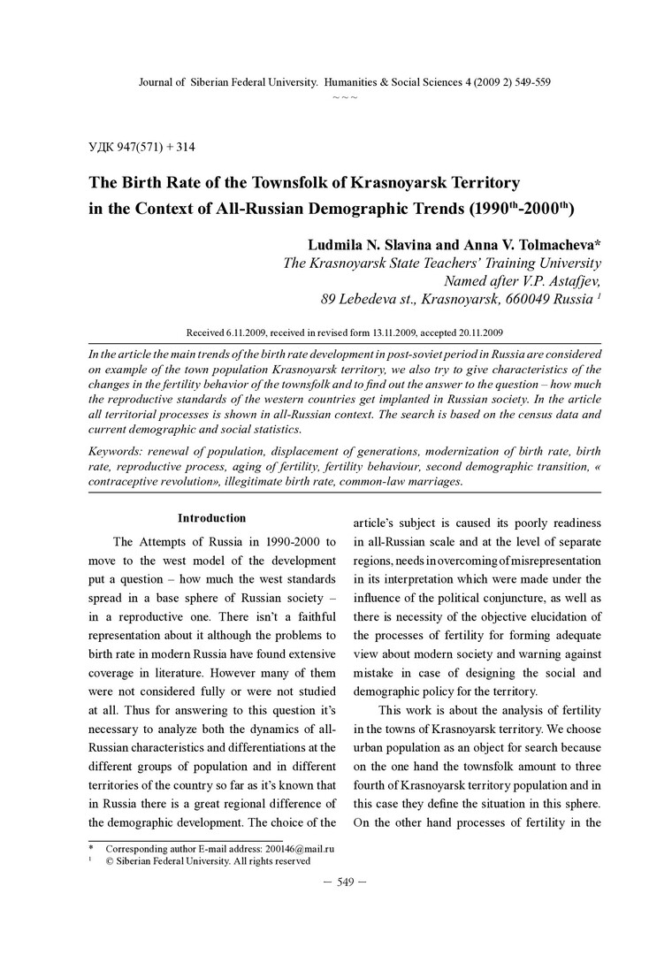 Библиографическое описание:Slavina, Ludmila. The Birth Rate of the Townsfolk of Krasnoyarsk Territory in the Context of All-Russian Demographic Trends (1990th-2000th) = Уровень рождаемости городского населения на территории Красноярска в контексте всероссийских демографических тенденций (1990-2000) / L. N. Slavina, A. V. Tolmacheva. - Текст : непосредственный // Журнал Сибирского федерального университета. Гуманитарные науки. - 2009. - Т. 2, № 4. - С. 549-559. - Библиогр.: с. 558-559 . - ISSN 1997-1370.