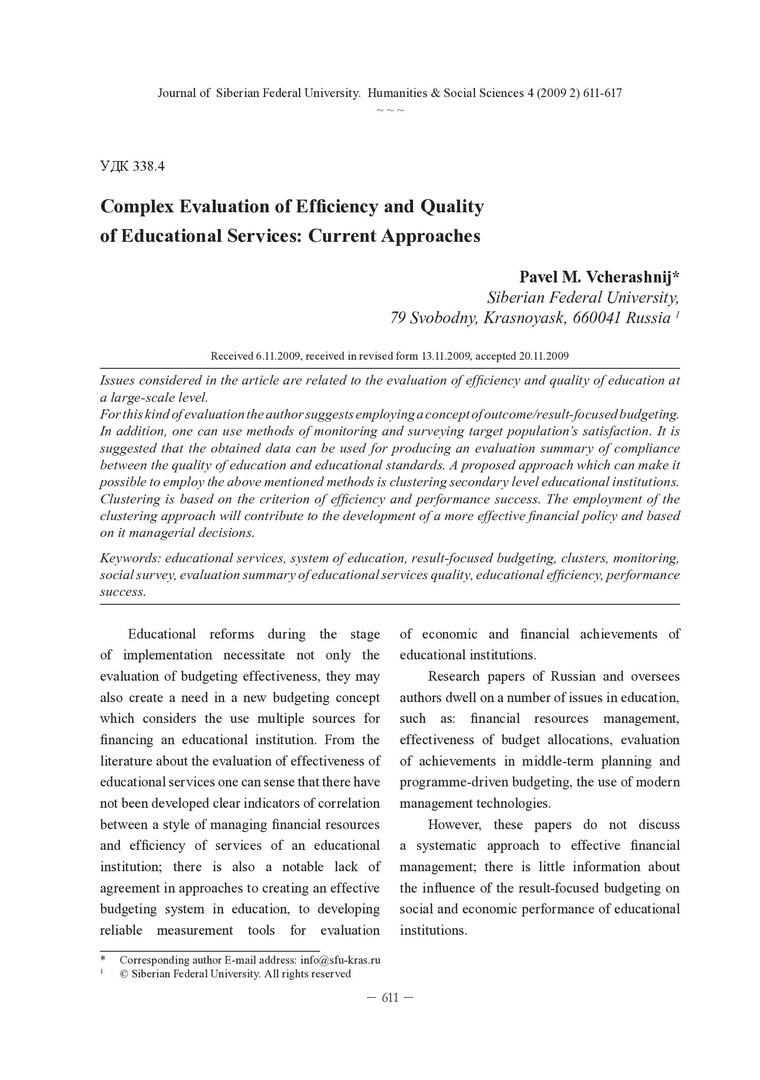 Библиографическое описание:Vcherashnij, Pavel. Complex Evaluation of Efficiency and Quality of Educational Services: Current Approaches = Методологические аспекты оценки эффективности и качества образования на современном этапе / P. M. Vcherashnij. - Текст : непосредственный // Журнал Сибирского федерального университета. Гуманитарные науки. - 2009. - Т. 2, № 4. - С. 611-617. - Библиогр.: с. 617. - ISSN 1997-1370.