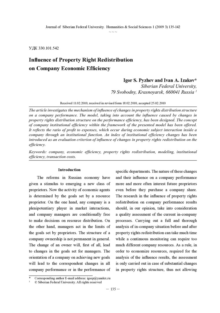 Библиографическое описание:Pyzhev, Igor. Influence of Property Right Redistribution on Company Economic Efficiency = Влияние перераспределения прав собственности на экономическую эффективность фирмы / I. S. Pyzhev, I. A. Izakov. - Текст : непосредственный // Журнал Сибирского федерального университета. Гуманитарные науки. - 2010. - Т. 3, № 1. - С. 135-142. - Библиогр.: с. 140-142. - ISSN 1997-1370.