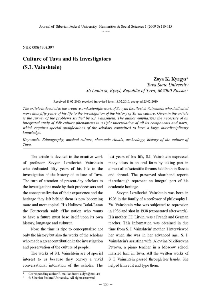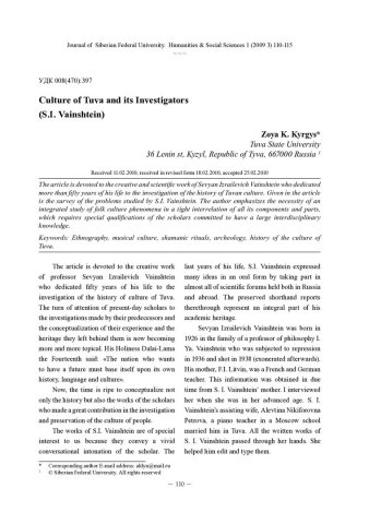 Библиографическое описание:Kyrgys, Zoya. Culture of Tuva and its Investigators (S.I. Vainshtein) = Культура Тувы и ее исследователи (С.И. Вайнштейн) / Z. K. Kyrgys. - Текст : непосредственный // Журнал Сибирского федерального университета. Гуманитарные науки. - 2010. - Т. 3, № 1. - С. 110-115. - Библиогр.: с. 115. - ISSN 1997-1370.