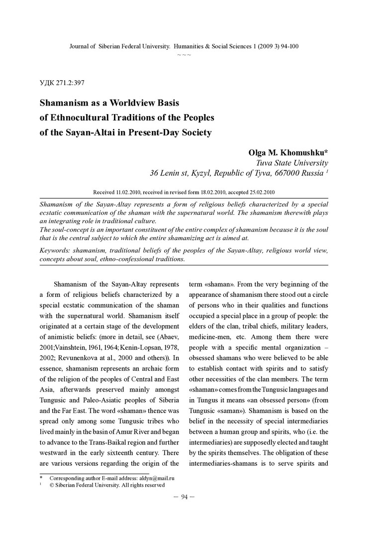 Библиографическое описание:Khomushku, Olga. Shamanism as a Worldview Basis of Ethnocultural Traditions of the Peoples of the Sayan-Altai in Present-Day Society = Шаманизм как мировоззренческая основа этнокультурных традиций народов Саяно-Алтая в современном обществе / O. M. Khomushku. - Текст : непосредственный // Журнал Сибирского федерального университета. Гуманитарные науки. - 2010. - Т. 3, № 1. - С. 94-100. - Библиогр.: с. 99. - ISSN 1997-1370.