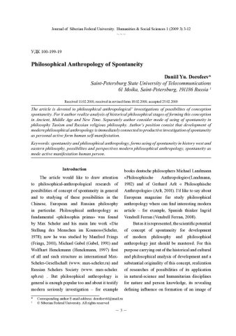 Библиографическое описание:Dorofeev, Daniil. Philosophical Anthropology of Spontaneity = Философская антропология спонтанности / Daniil Yu. Dorofeev. - Текст : непосредственный // Журнал Сибирского федерального университета. Гуманитарные науки. - 2010. - Т. 3, № 1. - С. 3-12. - Библиогр.: с. 10-12. - ISSN 1997-1370.
