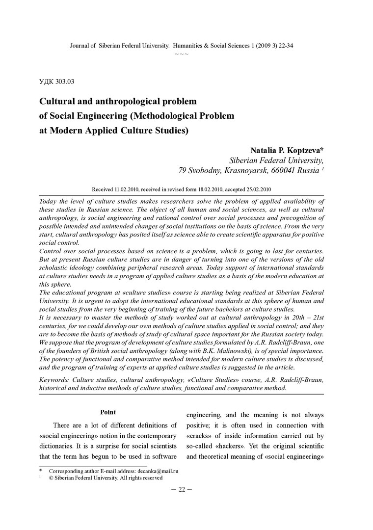 Библиографическое описание:Koptzeva, Natalia. Cultural and anthropological problem of Social Engineering (Methodological Problem at Modern Applied Culture Studies) = Культурно-антропологический проект социальной инженерии (проблема методологии современных прикладных культурных исследований) / N. P. Koptzeva. - Текст : непосредственный // Журнал Сибирского федерального университета. Гуманитарные науки. - 2010. - Т. 3, № 1. - С. 22-34. - Библиогр.: с. 32-34. - ISSN 1997-1370.