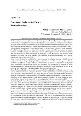 Библиографическое описание:Efimov, Valery. Practices of Exploring the Future: Russian Foresight = Практики работы с будущим: Русский Форсайт / V. S. Efimov, A. V. Lapteva. - Текст : непосредственный // Журнал Сибирского федерального университета. Гуманитарные науки. - 2010. - Т. 3, № 1. - С. 143-153. - Библиогр.: с. 152. - ISSN 1997-1370.