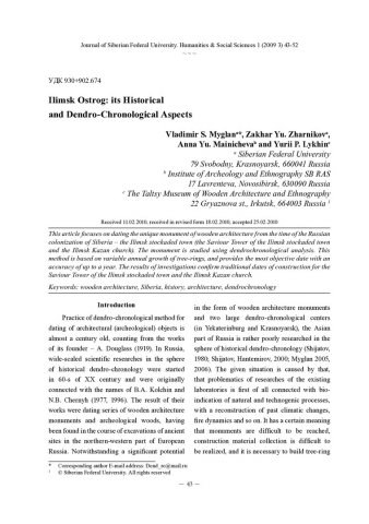Библиографическое описание:Ilimsk Ostrog: its Historical and Dendro-Chronological Aspects = Илимский острог: исторический и дендрохронологический аспекты / V. S. Myglan, Zakhar Yu. Zharnikov, Anna Yu. Mainicheva, Y. P. Lykhin. - Текст : непосредственный // Журнал Сибирского федерального университета. Гуманитарные науки. - 2010. - Т. 3, № 1. - С. 43-52. - Библиогр.: с. 51-52. - ISSN 1997-1370.