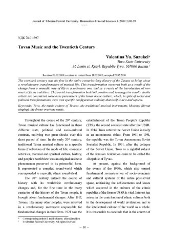 Библиографическое описание: Suzukei, Valentina. Tuvan Music and the Twentieth Century = ХХ век и тувинская музыка / Valentina Yu. Suzukei. - Текст : непосредственный // Журнал Сибирского федерального университета. Гуманитарные науки. - 2010. - Т. 3, № 1. - С. 80-93. - Библиогр.: с. 92-93. - ISSN 1997-1370.
