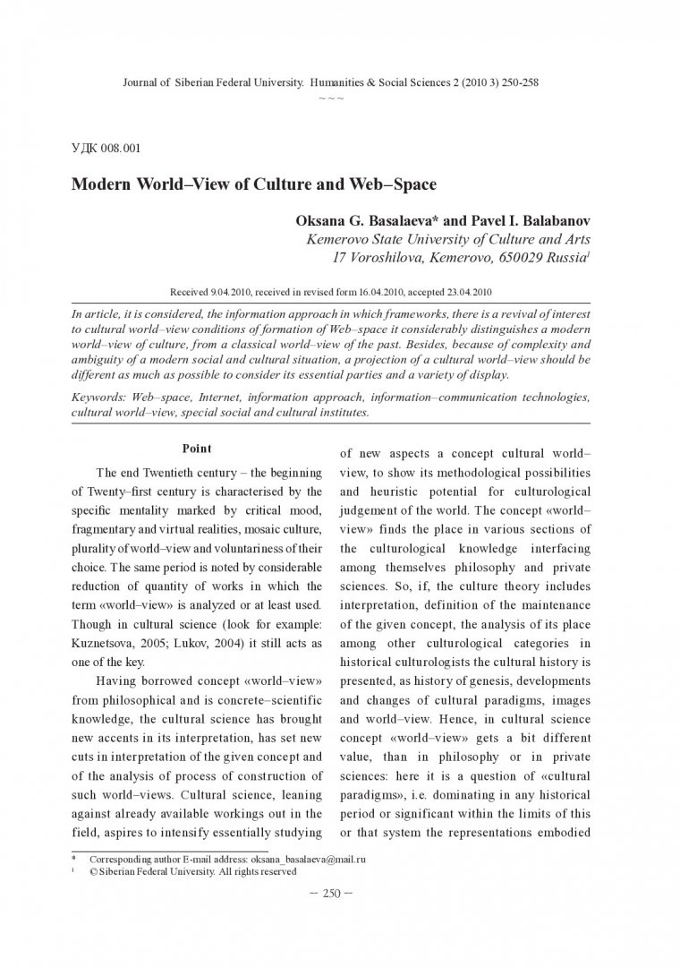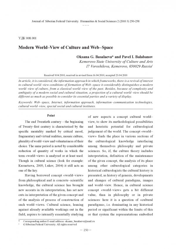 Библиографическое описание:Basalaeva, Oksana. Modern World-View of Culture and Web-Space = Современная картина мира культуры и Web-пространство / O. G. Basalaeva, P. I. Balabanov. - Текст : непосредственный // Журнал Сибирского федерального университета. Гуманитарные науки. - 2010. - Т. 3, № 2. - С. 250-258. - Библиогр.: с. 257-258. - ISSN 1997-1370.