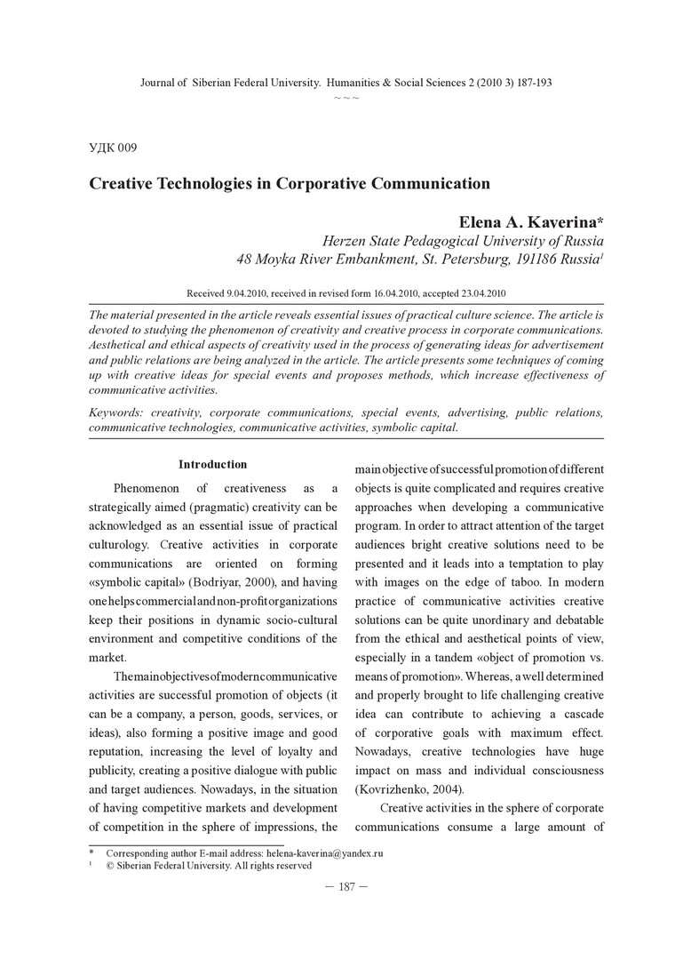 Библиографическое описание:Kaverina, Elena. Creative Technologies in Corporative Communication = Креативные технологии в корпоративных коммуникациях / E. A. Kaverina. - Текст : непосредственный // Журнал Сибирского федерального университета. Гуманитарные науки. - 2010. - Т. 3, № 2. - С. 187-193. - Библиогр.: с. 193. - ISSN 1997-1370.