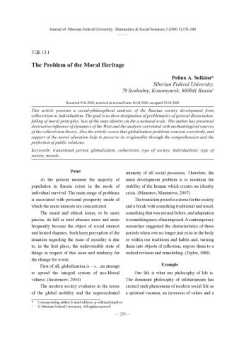 Библиографическое описание:Solkina, Polina. The Problem of the Moral Heritage = Проблема нравственного наследия / P. A. Solkina. - Текст : непосредственный // Журнал Сибирского федерального университета. Гуманитарные науки. - 2010. - Т. 3, № 2. - С. 233-240. - Библиогр.: с. 239-240. - ISSN 1997-1370.