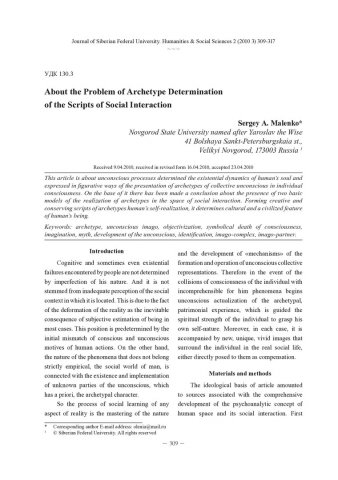 Библиографическое описание:Malenko, Sergey. About the Problem of Archetype Determination of the Scripts of Social Interaction = К проблеме архетипической детерминации сценариев социального взаимодействия / S. A. Malenko. - Текст : непосредственный // Журнал Сибирского федерального университета. Гуманитарные науки. - 2010. - Т. 3, № 2. - С. 309-317. - Библиогр.: с. 316-317. - ISSN 1997-1370.