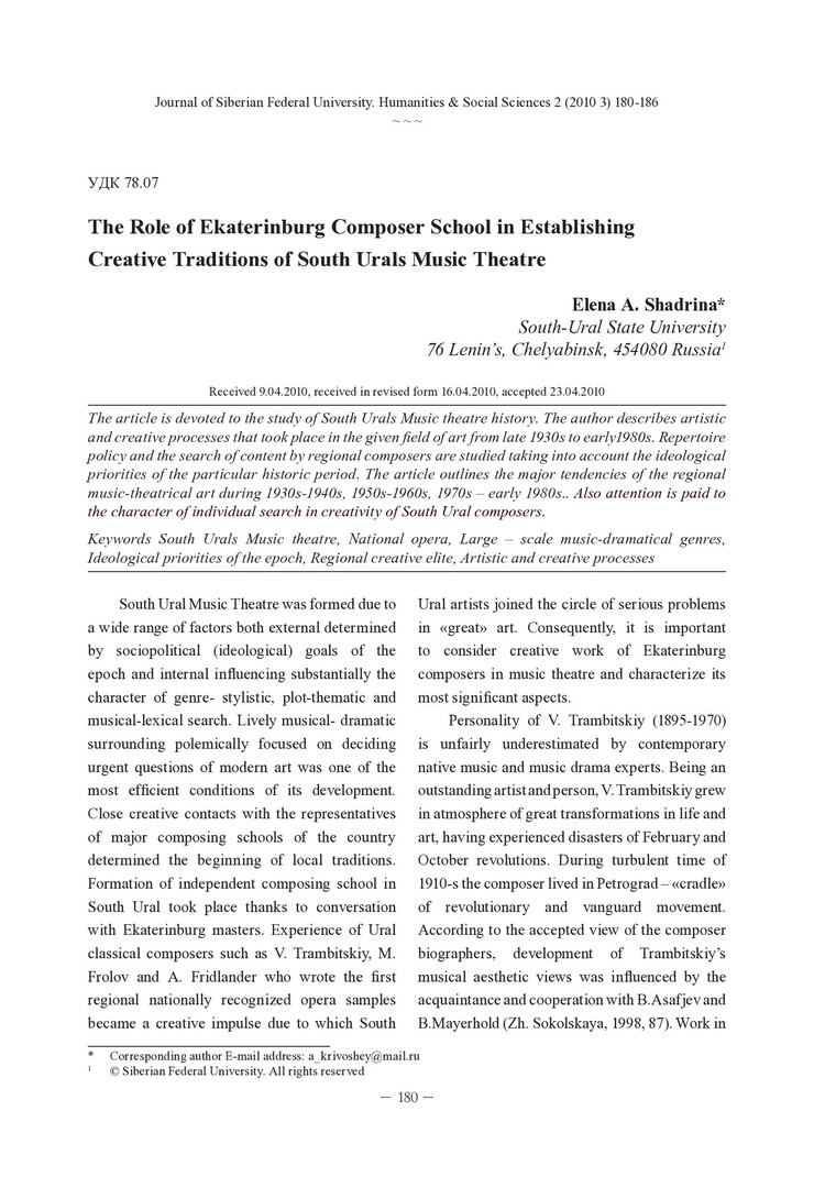 Библиографическое описание:Shadrina, Elena. The Role of Ekaterinburg Composer School in Establishing Creative Traditions of South Urals Music Theatre = Роль екатеринбургской композиторской школы в становлении творческих традиций Южно-Уральского музыкального театра / E. A. Shadrina. - Текст : непосредственный // Журнал Сибирского федерального университета. Гуманитарные науки. - 2010. - Т. 3, № 2. - С. 180-186. - Библиогр.: с. 185-186. - ISSN 1997-1370.