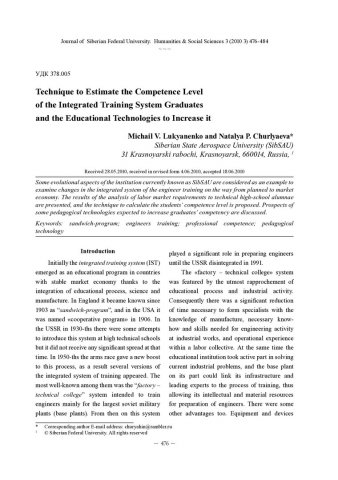 Библиографическое описание:Lukyanenko, Michail. Technique to Estimate the Competence Level of the Integrated Training System Graduates and the Educational Technologies to Increase it = Методика оценки уровня компетентности выпускников интегрированной системы обучения и педагогические технологии для его повышения / M. V. Lukyanenko, N. P. Churlyaeva. - Текст : непосредственный // Журнал Сибирского федерального университета. Гуманитарные науки. - 2010. - Т. 3, № 3. - С. 476-484. - Библиогр.: с. 484. - ISSN 1997-1370.