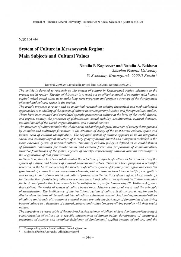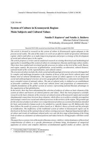 System of Culture in Krasnoyarsk Region: Main Subjects and Cultural Valuesстатья из журнала