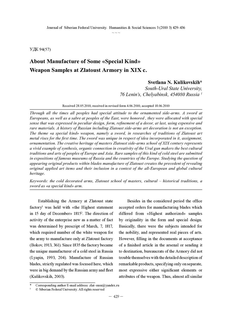 Библиографическое описание:Kulikovskih, Svetlana. About Manufacture of Some "Special Kind" Weapon Samples at Zlatoust Armory in XIX c. = О производстве некоторых образцов оружия "особого вида" на Златоустовской оружейной фабрике в XIX в. / S. N. Kulikovskih. - Текст : непосредственный // Журнал Сибирского федерального университета. Гуманитарные науки. - 2010. - Т. 3, № 3. - С. 429-436. - Библиогр.: с. 434-436. - ISSN 1997-1370.