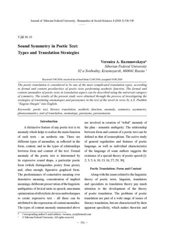Библиографическое описание:Razumovskaya, Veronica. Sound Symmetry in Poetic Text: Types and Translation Strategies = Звуковая симметрия в поэтическом тексте: типы и стратегии перевода / V. A. Razumovskaya. - Текст : непосредственный // Журнал Сибирского федерального университета. Гуманитарные науки. - 2010. - Т. 3, № 4. - С. 536-545. - Библиогр.: с. 543-545. - ISSN 1997-1370.