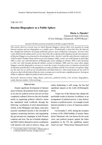 Библиографическое описание: Pipenko, Maria. Russian Blogosphere as a Public Sphere = Русскоязычная блогосфера как особое пространство выражения гражданской позиции / M. A. Pipenko. - Текст : непосредственный // Журнал Сибирского федерального университета. Гуманитарные науки. - 2010. - Т. 3, № 4. - С. 526-535. - Библиогр.: с. 533-535. - ISSN 1997-1370.