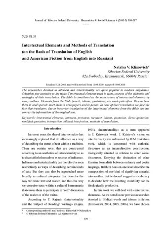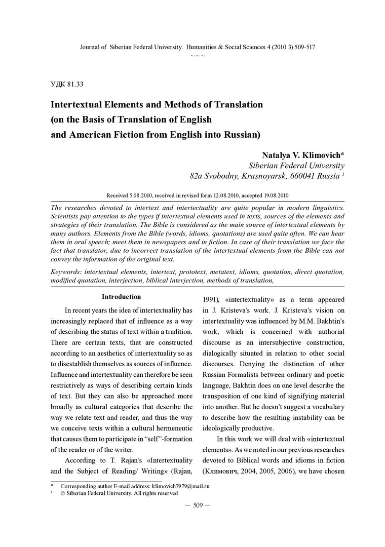 Библиографическое описание:Klimovich, Natalya. Intertextual Elements and Methods of Translation (on the Basis of Translation of English and American Fiction from English into Russian) = Интертекстуальные элементы и методы их перевода / N. V. Klimovich. - Текст : непосредственный // Журнал Сибирского федерального университета. Гуманитарные науки. - 2010. - Т. 3, № 4. - С. 509-517. - Библиогр.: с. 516-517. - ISSN 1997-1370.