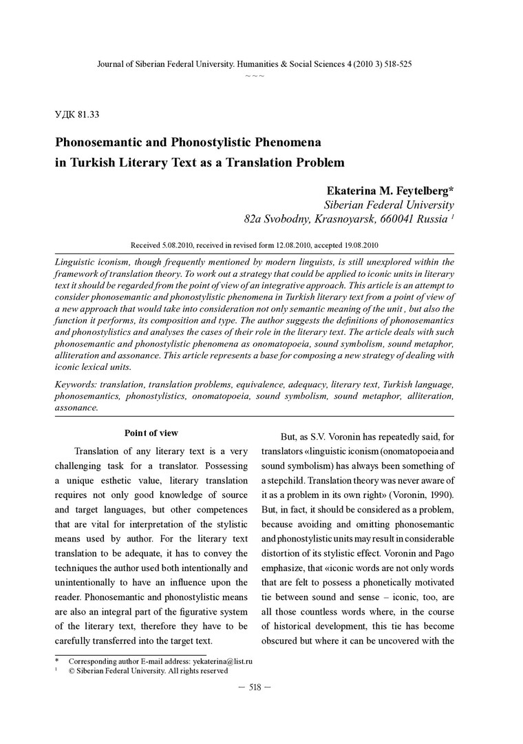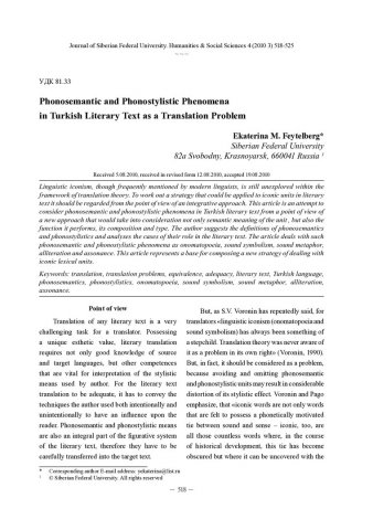 Библиографическое описание: Feytelberg, Ekaterina. Phonosemantic and Phonostylistic Phenomena in Turkish Literary Text as a Translation Problem = Фоносемантические и фоностилистические явления в турецком художественном тексте как переводческая проблема / E. M. Feytelberg. - Текст : непосредственный // Журнал Сибирского федерального университета. Гуманитарные науки. - 2010. - Т. 3, № 4. - С. 518-525. - Библиогр.: с. 524-525. - ISSN 1997-1370.