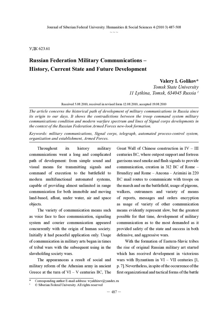 Библиографическое описание:Golikov, Valery. Russian Federation Military Communications - History, Current State and Future Development = История, современное состояние и перспективы развития военной связи в Российской Федерации / V. I. Golikov. - Текст : непосредственный // Журнал Сибирского федерального университета. Гуманитарные науки. - 2010. - Т. 3, № 4. - С. 487-508. - Библиогр.: с. 506-508. - ISSN 1997-1370.