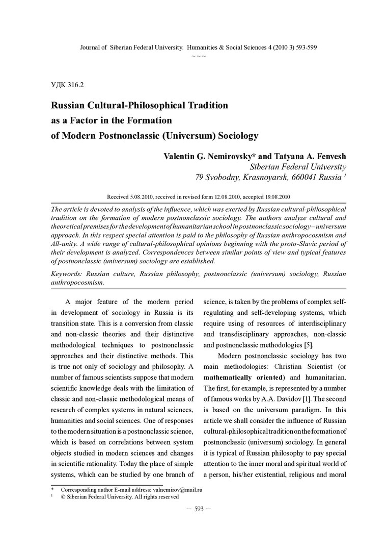 Библиографическое описание:Nemirovsky, Valentin. Russian Cultural-Philosophical Tradition as a Factor in the Formation of Modern Postnonclassic (Universum) Sociology = Русская культурно-философская традиция как фактор формирования современной постнеклассической (универсумной) социологии / V. G. Nemirovsky, T. A. Fenvesh. - Текст : непосредственный // Журнал Сибирского федерального университета. Гуманитарные науки. - 2010. - Т. 3, № 4. - С. 593-599. - Библиогр.: с. 599. - ISSN 1997-1370.