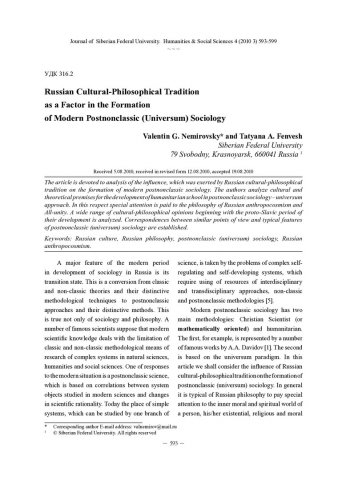 Аннотация:Статья посвящена анализу влияния русской культурно-философской традиции на становление современной постнеклассической социологии. Рассматриваются культурные и теоретические предпосылки развития гуманитарного направления постнеклассической социологии - универсумного подхода.