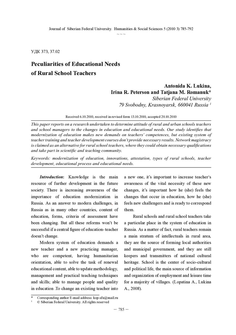 Библиографическое описание:Lukina, Antonida. Peculiarities of Educational Needs of Rural School Teachers = Особенности образовательных потребностей педагогов сельских школ / A. K. Lukina, I. R. Peterson, T. M. Romanuk. - Текст : непосредственный // Журнал Сибирского федерального университета. Гуманитарные науки. - 2010. - Т. 3, № 5. - С. 785-792. - Библиогр.: с. 792. - ISSN 1997-1370.