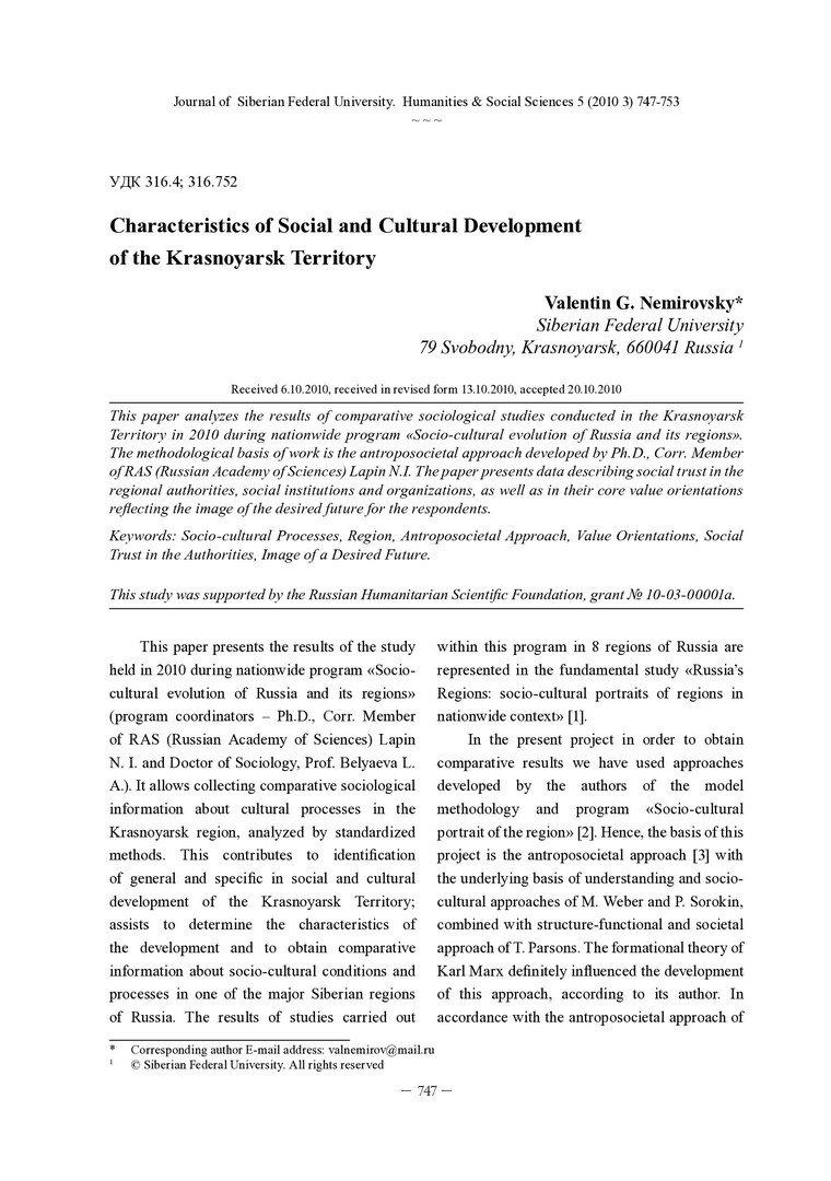 Аннотация:Статья посвящена анализу результатов сравнительного социологического исследования, проведенного в Красноярском крае в 2010 году в рамках общероссийской программы "Социокультурная эволюция России и ее регионов".