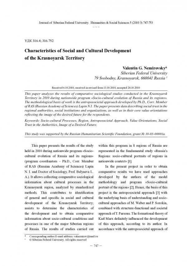 Библиографическое описание:Nemirovsky, Valentin. Characteristics of Social and Cultural Development of the Krasnoyarsk Territory = Характеристики социокультурного развития Красноярского края / V. G. Nemirovsky. - Текст : непосредственный // Журнал Сибирского федерального университета. Гуманитарные науки. - 2010. - Т. 3, № 5. - С. 747-753. - Библиогр.: с. 752-753. - ISSN 1997-1370.