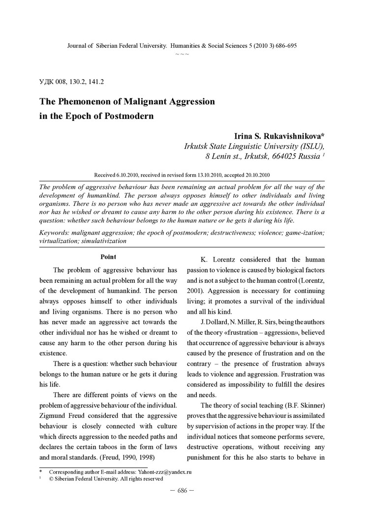 Библиографическое описание:Rukavishnikova, Irina. The Phemonenon of Malignant Aggression in the Epoch of Postmodern = Феномен злокачественной агрессии в эпоху постмодерна / I. S. Rukavishnikova. - Текст : непосредственный // Журнал Сибирского федерального университета. Гуманитарные науки. - 2010. - Т. 3, № 5. - С. 686-695. - Библиогр.: с. 694-695. - ISSN 1997-1370.
