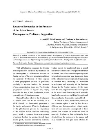 Библиографическое описание:Tulokhonov, Arnold. Resource Economics in the Frontier of the Asian Russia: Consequences, Problems, Suggestions = Ресурсная экономика в приграничье азиатской России: следствия, проблемы, предложения / A. K. Tulokhonov, D. A. Darbalaeva. - Текст : непосредственный // Журнал Сибирского федерального университета. Гуманитарные науки. - 2010. - Т. 3, № 6. - С. 951-961. - Библиогр.: с. 960-961. - ISSN 1997-1370.