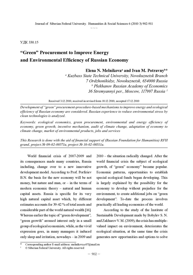 Библиографическое описание:Melnikova, Elena. Green Procurement to Improve Energy and Environmental Efficiency of Russian Economy = Повышение энергетической и экологической эффективности российской экономики на основе процедуры "зеленых" закупок / E. N. Melnikova, I. M. Potravny. - Текст : непосредственный // Журнал Сибирского федерального университета. Гуманитарные науки. - 2010. - Т. 3, № 6. - С. 902-911. - Библиогр.: с. 909-911. - ISSN 1997-1370.