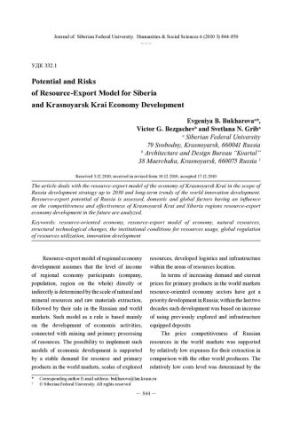 Библиографическое описание: Bukharova, Evgeniya. Potential and Risks of Resource-Export Model for Siberia and Krasnoyarsk Krai Economy Development = Потенциал и риски ресурсно-экспортной модели экономического развития Сибири и Красноярского края / E. B. Bukharova, V. G. Bezgachev, S. N. Grib. - Текст : непосредственный // Журнал Сибирского федерального университета. Гуманитарные науки. - 2010. - Т. 3, № 6. - С. 844-850. - Библиогр.: с. 849-850. - ISSN 1997-1370.