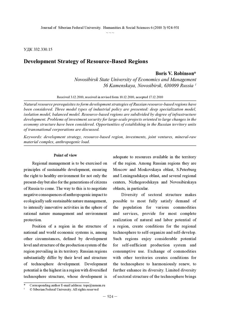 Библиографическое описание:Robinson, Boris. Development Strategy of Resource-Based Regions = Стратегии развития регионов ресурсно-сырьевой специализации / B. V. Robinson. - Текст : непосредственный // Журнал Сибирского федерального университета. Гуманитарные науки. - 2010. - Т. 3, № 6. - С. 924-931. - Библиогр.: с. 931. - ISSN 1997-1370.