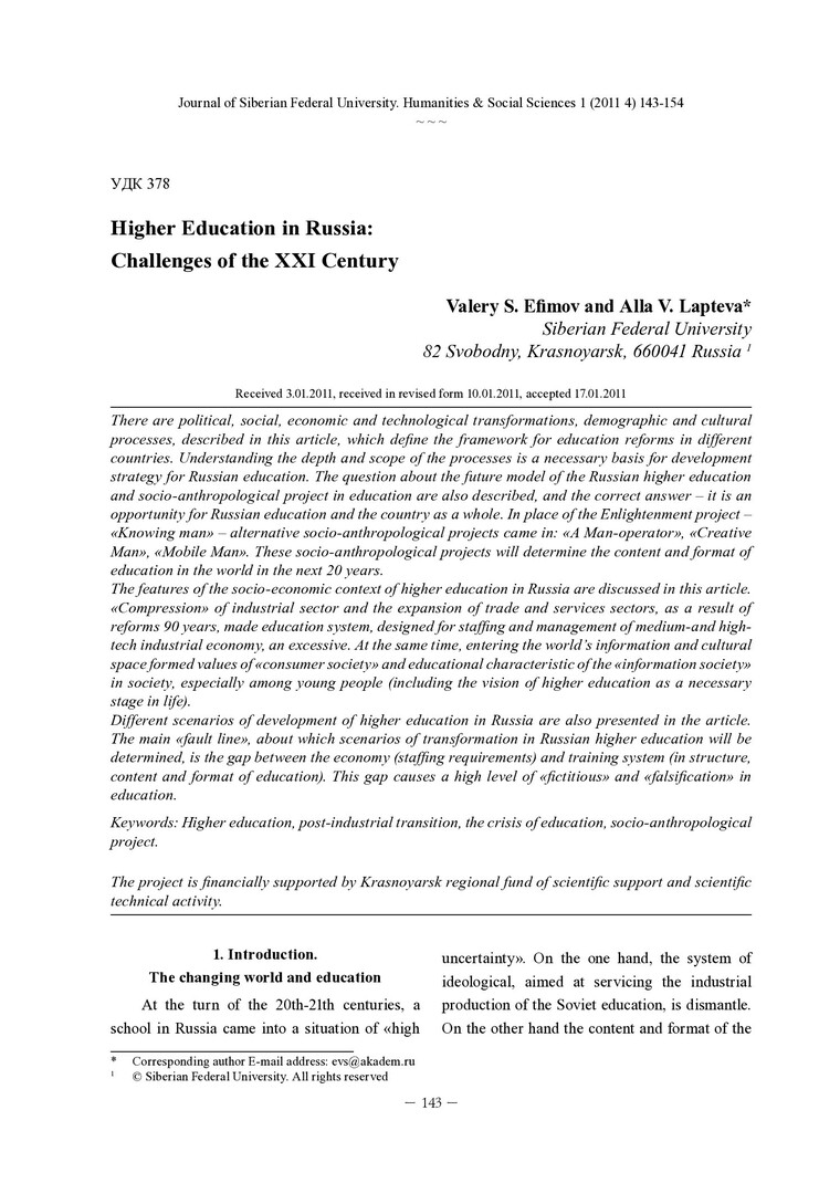 Библиографическое описание:Efimov, Valery. Higher Education in Russia: Challenges of the XXI Century = Высшее образование в России: вызовы XXI века / V. S. Efimov, A. V. Lapteva. - Текст : непосредственный // Журнал Сибирского федерального университета. Гуманитарные науки. - 2011. - Т. 4, № 1. - С. 143-154. - Библиогр.: с. 153-154. - ISSN 1997-1370.