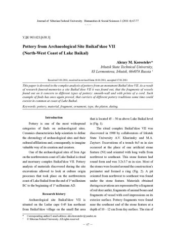 Библиографическое описание:Korostelev, Alexey. Pottery from Archaeological Site Baikalskoe VII (North-West Coast of Lake Baikal) = Керамика с археологического комплекса Байкальское VII (северо-западное побережье озера Байкал) / A. M. Korostelev. - Текст : непосредственный // Журнал Сибирского федерального университета. Гуманитарные науки. - 2011. - Т. 4, № 1. - С. 67-77. - Библиогр.: с. 76-77. - ISSN 1997-1370.