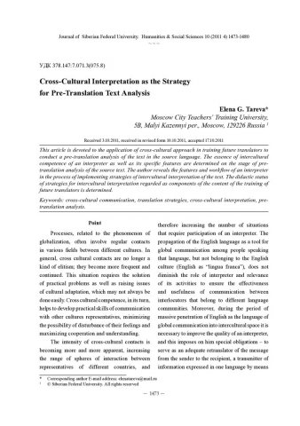 Библиографическое описание:Tareva, Elena. Cross-Cultural Interpretation as the Strategy for Pre-Translation Text Analysis = Межкультурная интерпретация как стратегия предпереводческого анализа текста / E. G. Tareva. - Текст : непосредственный // Журнал Сибирского федерального университета. Гуманитарные науки. - 2011. - Т. 4, № 10. - С. 1473-1480. - Библиогр.: с. 1479-1480. - ISSN 1997-1370.