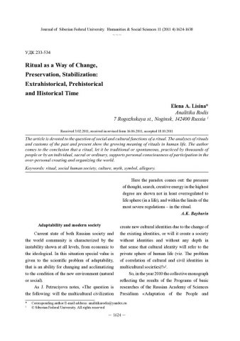 Библиографическое описание:Lisina, Elena. Ritual as a Way of Change, Preservation, Stabilization: Extrahistorical, Prehistorical and Historical Time = Ритуал как способ изменения, сохранения, стабилизации: внеисторическое, доисторическое и историческое время / E. A. Lisina. - Текст : непосредственный // Журнал Сибирского федерального университета. Гуманитарные науки. - 2011. - Т. 4, № 11. - С. 1624-1638. - Библиогр.: с. 1636-1638. - ISSN 1997-1370.