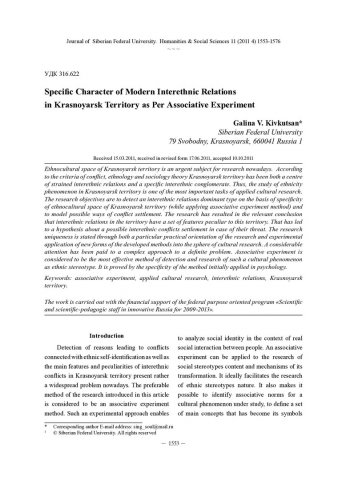 Библиографическое описание:Kivkutsan, Galina. Specific Character of Modern Interethnic Relations in Krasnoyarsk Territory as Per Associative Experiment = Специфика современных межэтнических отношений на территории Красноярского края на материале ассоциативного эксперимента / G. V. Kivkutsan. - Текст : непосредственный // Журнал Сибирского федерального университета. Гуманитарные науки. - 2011. - Т. 4, № 11. - С. 1553-1576. - Библиогр.: с. 1575-1576. - ISSN 1997-1370.
